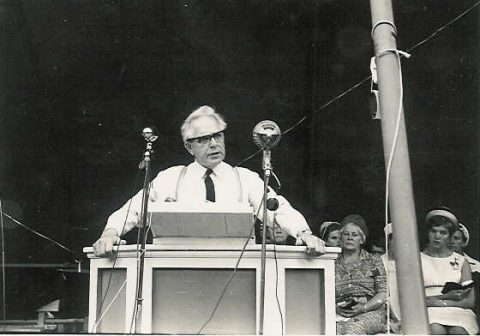 Pastor Thor Sørlie taler på Stevnet i Sarons Dal 1965.